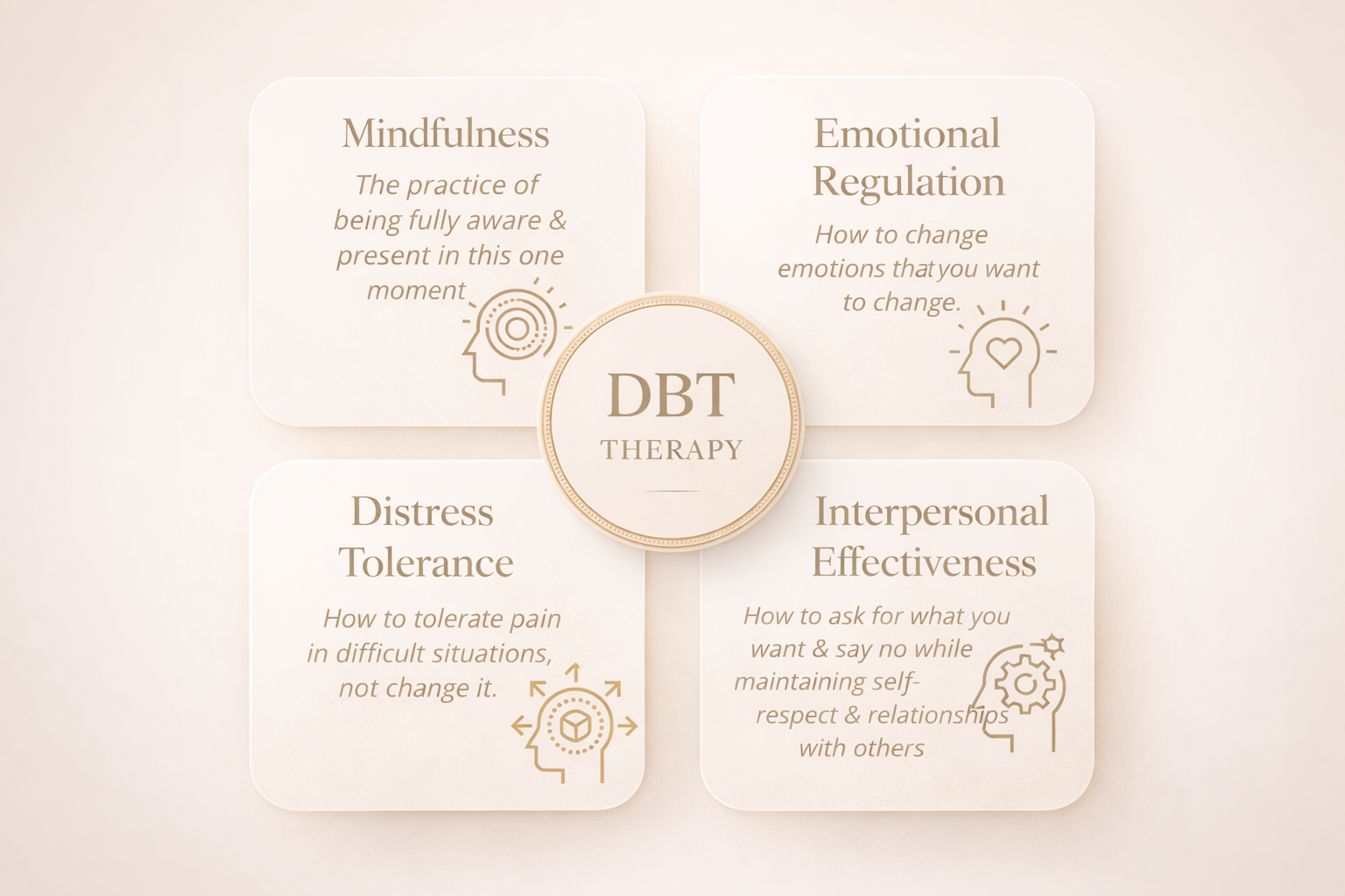 DBT focuses on the development of practical, life-enhancing skills across four core areas: emotional regulation, distress tolerance, mindfulness, and interpersonal effectiveness. Clients learn how to manage intense emotional states, reduce impulsive responses, tolerate distress without resorting to harmful behaviours, and communicate needs more effectively within relationships.