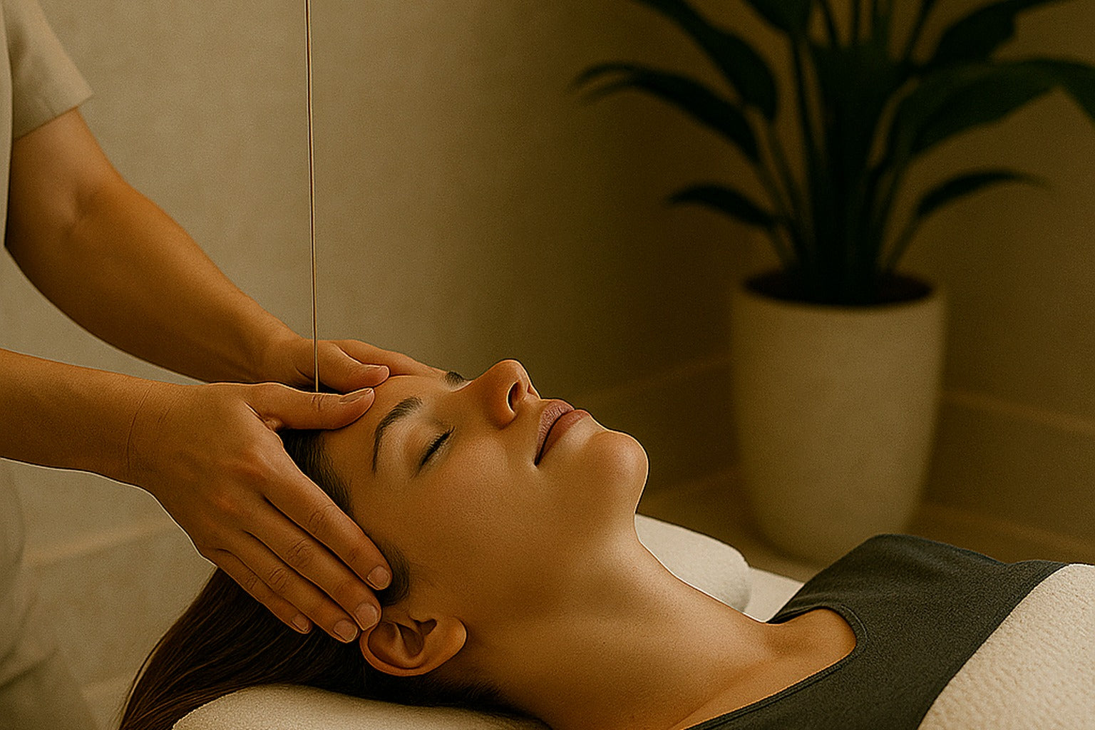 Warm oils, rhythmic scalp and neck work, and optional forehead stream to quiet busy thinking and protect recovery sleep.