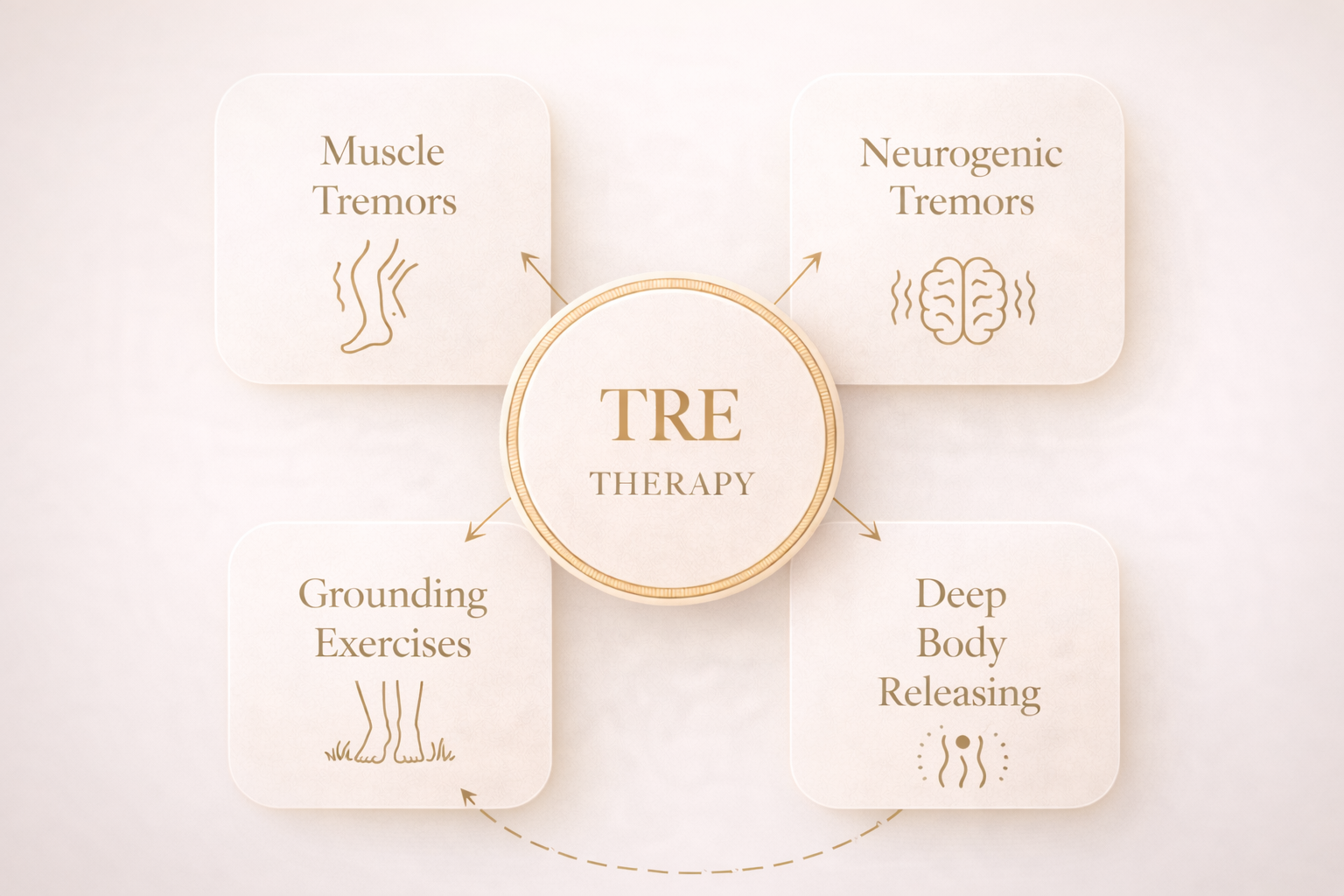 TRE® (Tension & Trauma Releasing Exercises) and Somatic Therapy are body-based therapeutic approaches designed to release stored stress, tension, and trauma from the nervous system. Rather than working primarily through cognitive processing, these modalities focus on the body’s innate capacity to regulate, discharge activation, and restore a sense of internal safety.